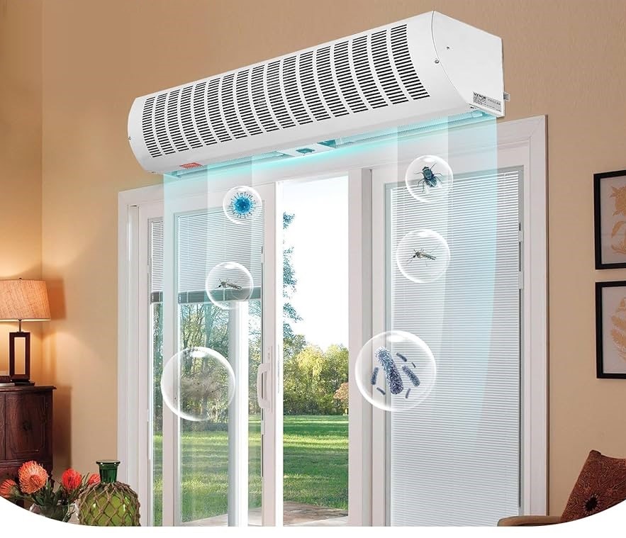 Devices installed above doorways to create a high-velocity air barrier that helps separate interior and exterior air, reducing dust, insects, odors, and temperature exchange