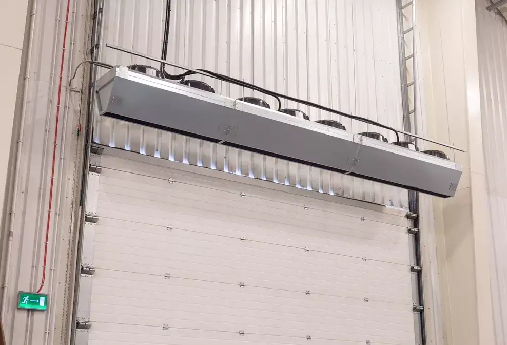 Industrial air curtains designed to block dust and insects in commercial spaces.