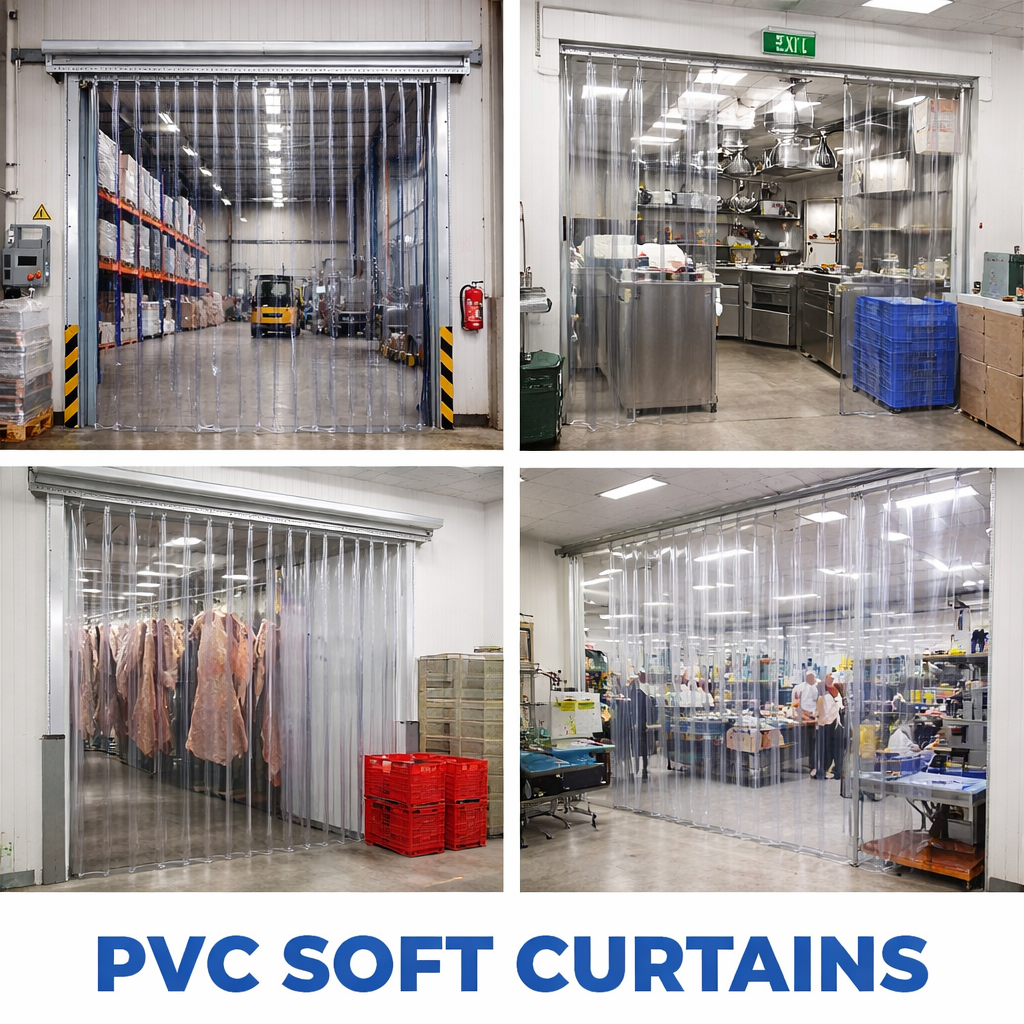 Soft Wall PVC Curtains — flexible, clear or colored PVC strip or panel curtains used to divide spaces, control airflow, and allow easy movement in industrial or commercial settings